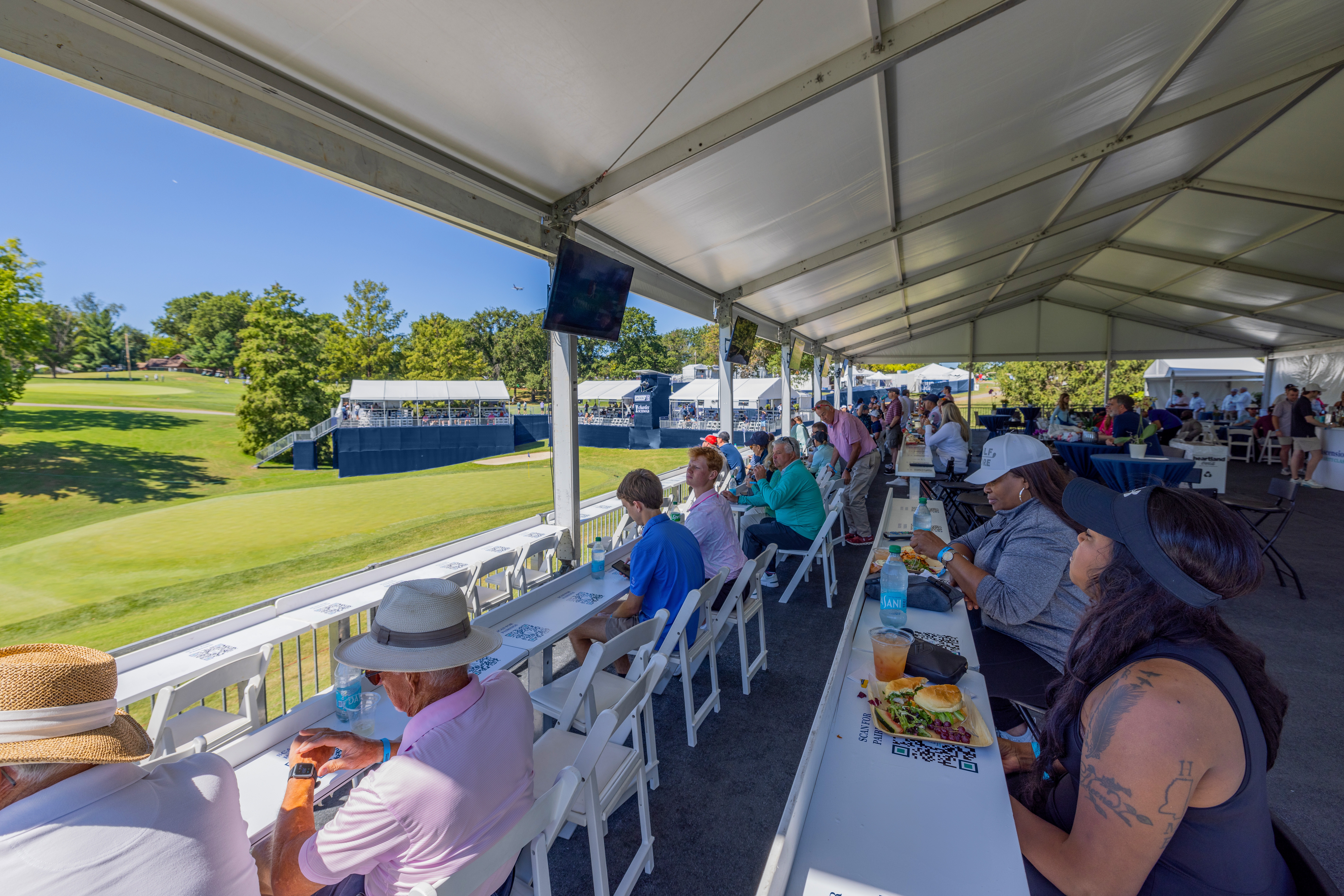 The shared venue on the 16th green, offers guests an exceptional view and premier hospitality experience. Featuring non-reserved access to an open-air pavilion with a sports bar atmosphere, this location also provides tiered stadium-style seating overlooking the 16th green. Full beverage service as well as a lunch buffet and afternoon snacks are included, along with a mounted flat-screen television and access to private restrooms.